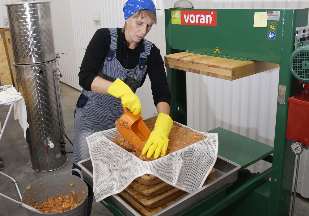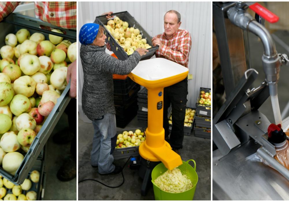 När Tidningen 7 besöker musteriet är paret i full färd med att pressa 80 kilo äpplen till en kund. Den fruktmassa som hamnat i stora byttor efter att äpplena fått en genomkörare i fruktkrossen, läggs upp lager för lager i en stor fruktpress.