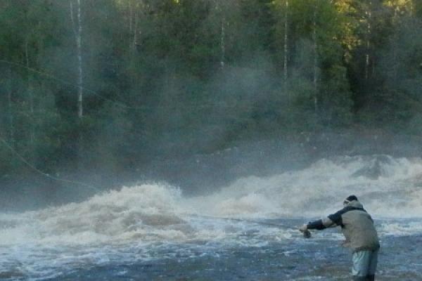"Laxen hade rusat in i en mindre fåra till vänster om ön där älven delar sig. Det tog en stund innan jag fick kontakt med den. Sen kom ett häftigt ryck och ......"