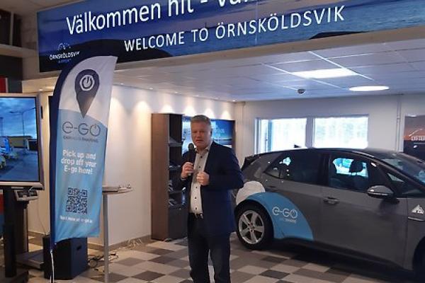 Nya mobilitets- och bildelningstjänsten E-go lanseras i Örnsköldsvik och ska underlätta för fler att resa hållbart. Robert Gyllroth, vd Örnsköldsvik Airport, inviger den nya tjänsten.