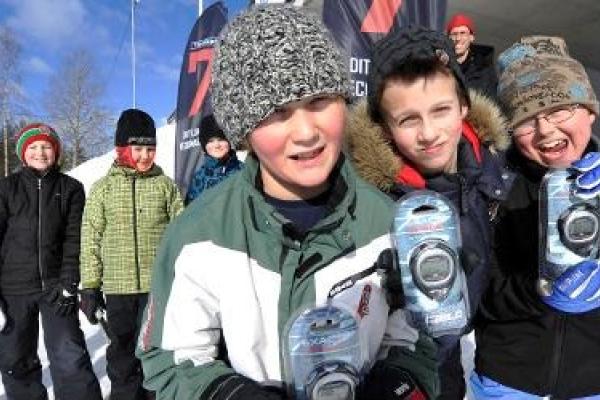 Edvin Morin, Emil Widhagen och Karl Fällman delade förstaplatsen i madrassåkningstävlingen på Skyttis i lördags.