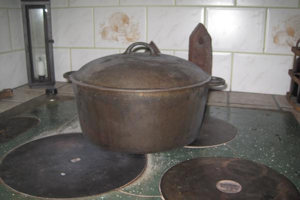 För länge sedan, innan Leon föddes, köpte vi en liten gjutjärnsgryta. Igår på loppis uppe i Västerbotten hittade vi en till, 10-liters, i helt mint condition till det facila priset av 350 riksdaler. Matlagning i annat än gjutjärn är inte jämförbart!