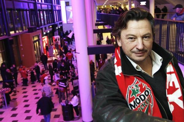 Melodifestivaldebutanten Anders Ekborg är på plats i Fjällräven Center redan en dryg vecka innan Melodifestivalen - för att sjunga nationalsången och spela lite hockey mot Peter Forsberg.