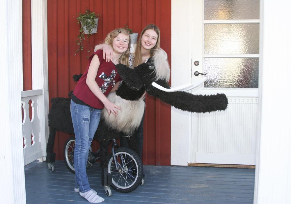Tidigare har tjejerna byggt en stillastående häst. Nu ville de skapa något rörligare och då fick en släkting till Alma offra sin gamla pojkcykel. Material har det fixat på egen hand och med hjälp av närstående.