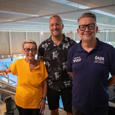 Under onsdagskvällen 4 september invigdes den nya och efterlängtade simhallen i Örnsköldsvik. Från vänster i bild: Höga kustens simsällskaps ordförande Birgitta Mårtensson, Paradisets enhetschef David Berglund och ordförande i Örnsköldsviks allmänna simsällskap Lars Edberg.