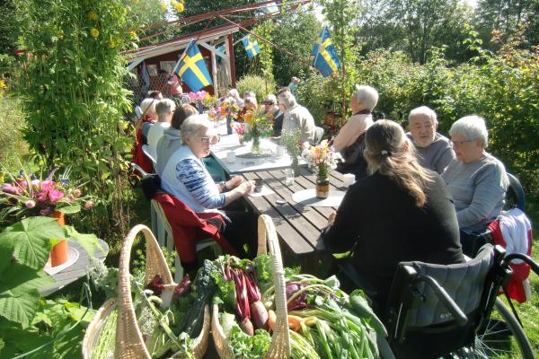 Våra gäster från seniorboendet Eken i Järved kom med solen och värmen onsdag den 30 augusti. Eftersom det är tredje året i rad som de hälsar på hos oss ute i Tvillingsta koloniområde, var det ett glatt återseende.
