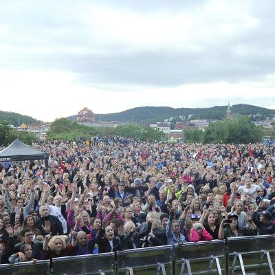 Picnickfiltarna var utbytta mot paraplyer och regnkappor, men stämningen var ändå högt. Drygt 4000 personer trotsade det gråa vädret när Petters intog scenen under årets Sjunde i sjunde.