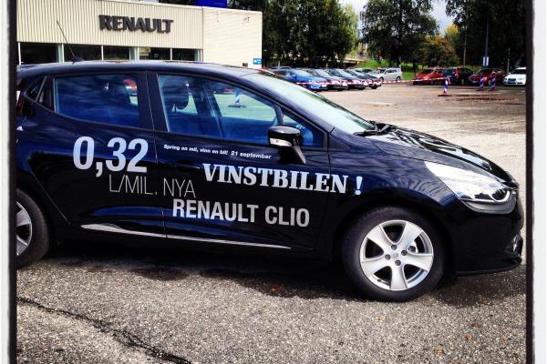 Bilbolagets slogan slår emot oss cirka 500 deltagare. En Renault Clio stod och glänste i solen vid scenen ute på den stora parkeringen. Efter en mils löpning fanns chansen att själv köra den hem!