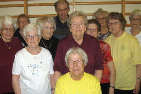 Britta Sandin sittande framför gruppen som hon tränat gymnastik med i många år.