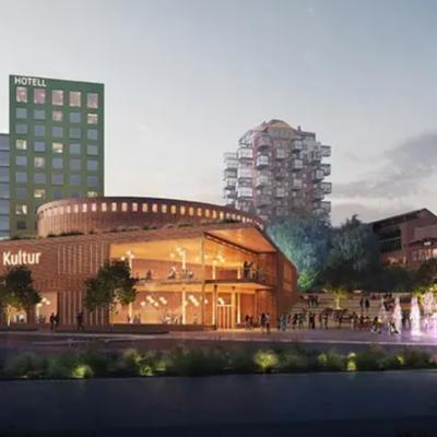 I och med en markanvisning för hotellbygge tas det första steget mot ett samlat centrum för kultur och evenemang i Örnsköldsvik. Det här är en fiktiv bild som visar hur området kring gamla busstationstomten kan se ut förvandlad till ett kultur- och evenemangscentrum. Illustration: Urban Minds Tengbom Neon Studio.